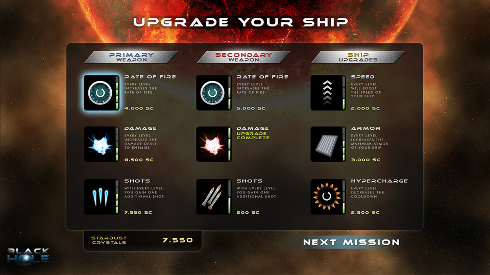 - Upgrade System, use your earned points to upgrade your ship and your weaponry